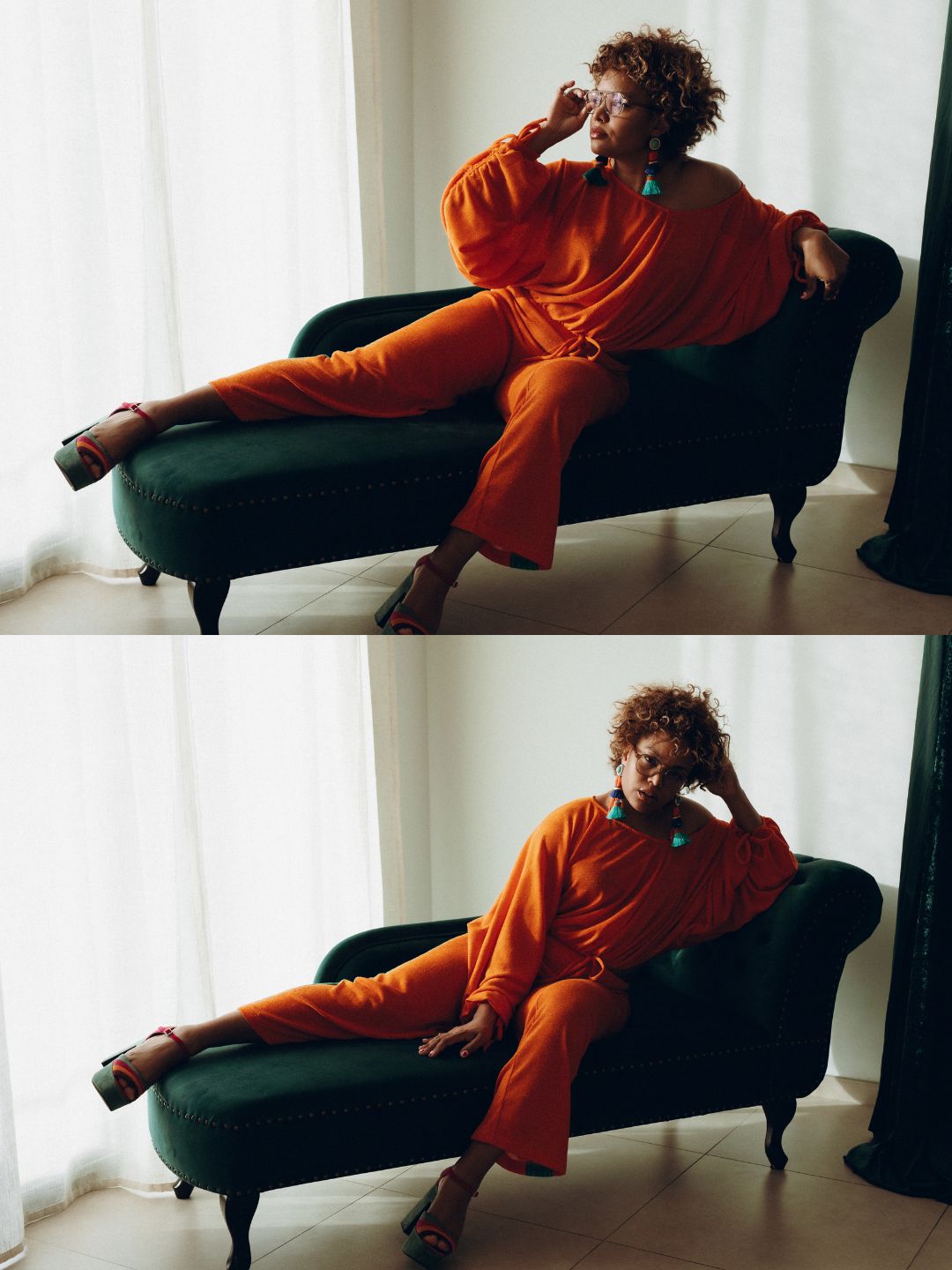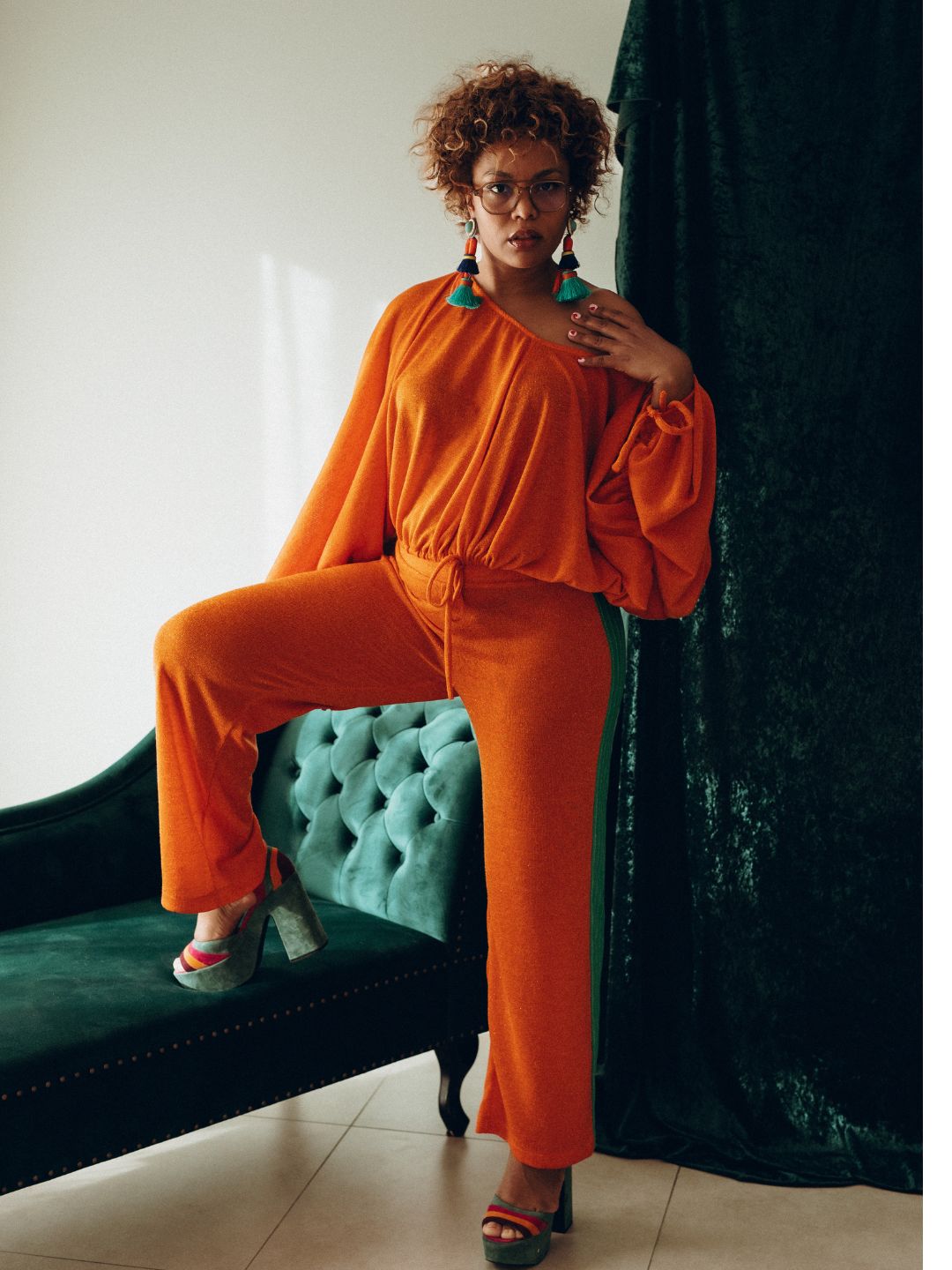 ZELIE ONE - PANTALON LARGE MAILLE ORANGE ET BANDES VERTES