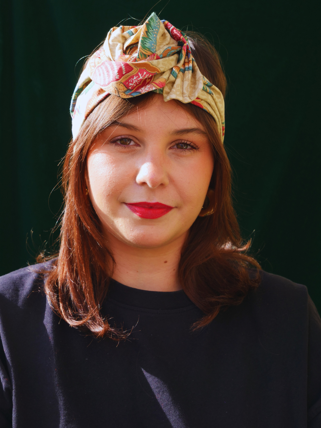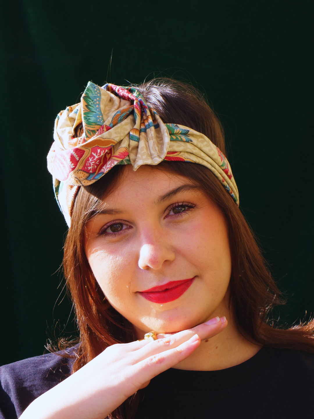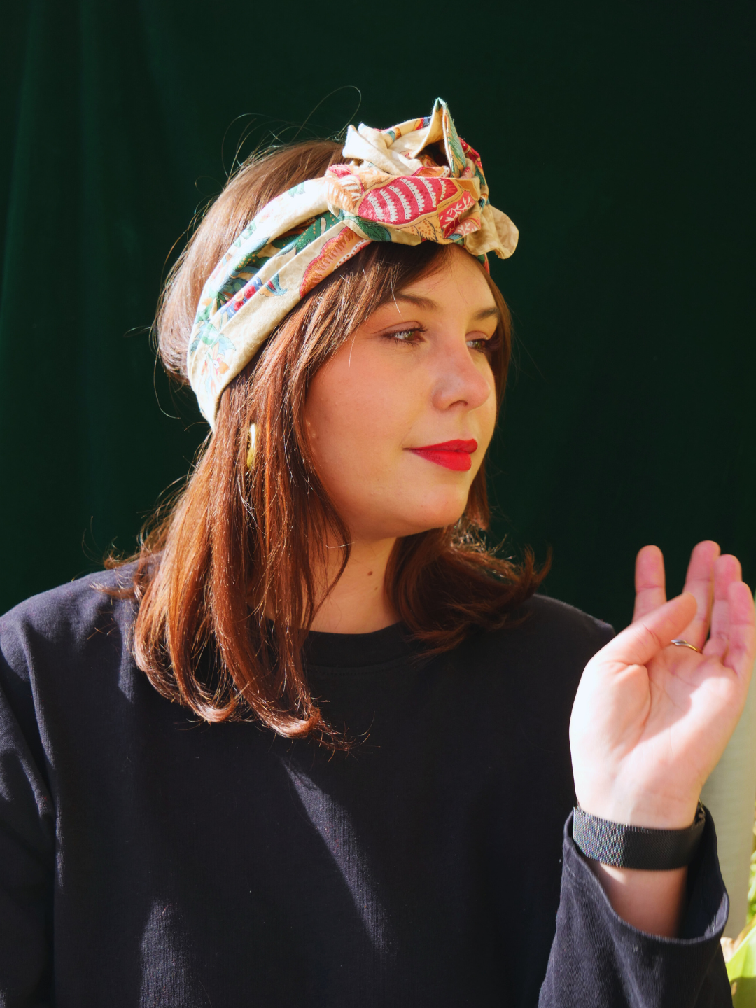 À mi-chemin entre le bandeau et le turban, ce modèle flexible se met en place en quelques secondes grâce à sa tige métallique intégrée.